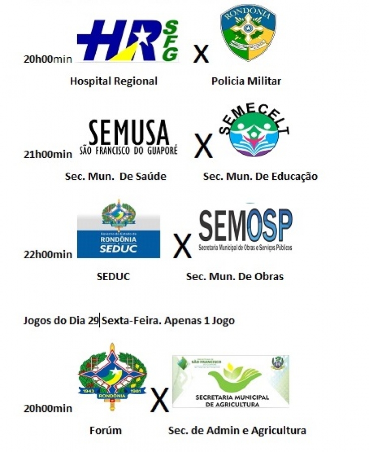 Nesta Quinta-feira dia 28 de Novembro, começa o 2º Campeonato de Futsal de Servidores Públicos, com inicio às 20 horas no Ginásio de Esporte do Bairro Alto Alegre, com três Jogos sendo eles 1º Jogo entre Hospital Regional x Policia Militar, 2º jogo Sec. Mun. De Saúde x Sec. Mun. De Educação e 3º jogo Seduc x Sec. Mun. De Obras.
